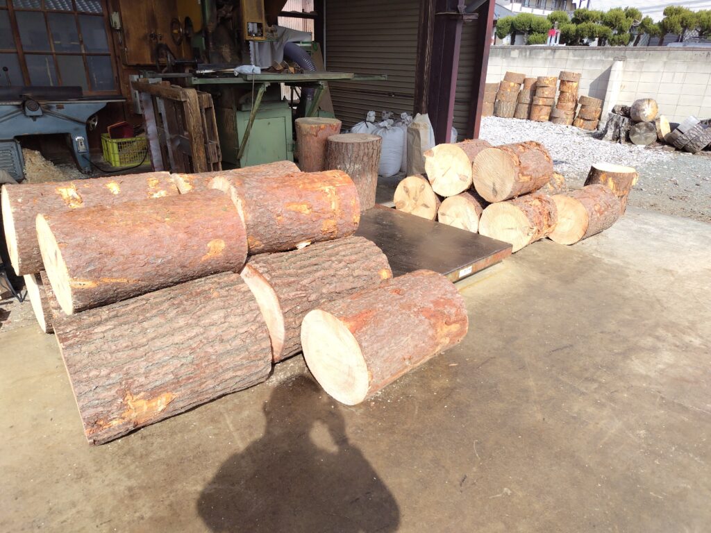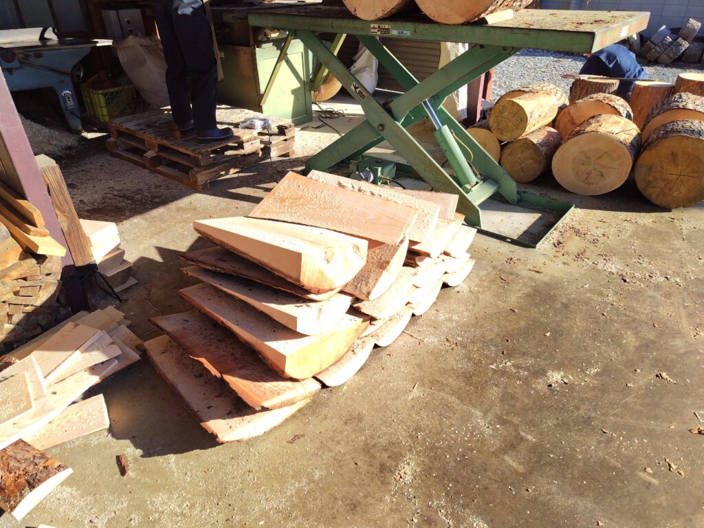 帯鋸で切断された材は上の写真の様に四角い材になります。ただ、全てが全て四角くなるわけではなく、角の部分が曲面になっているものも多いので、そういった材はもう1過程必要になります。
