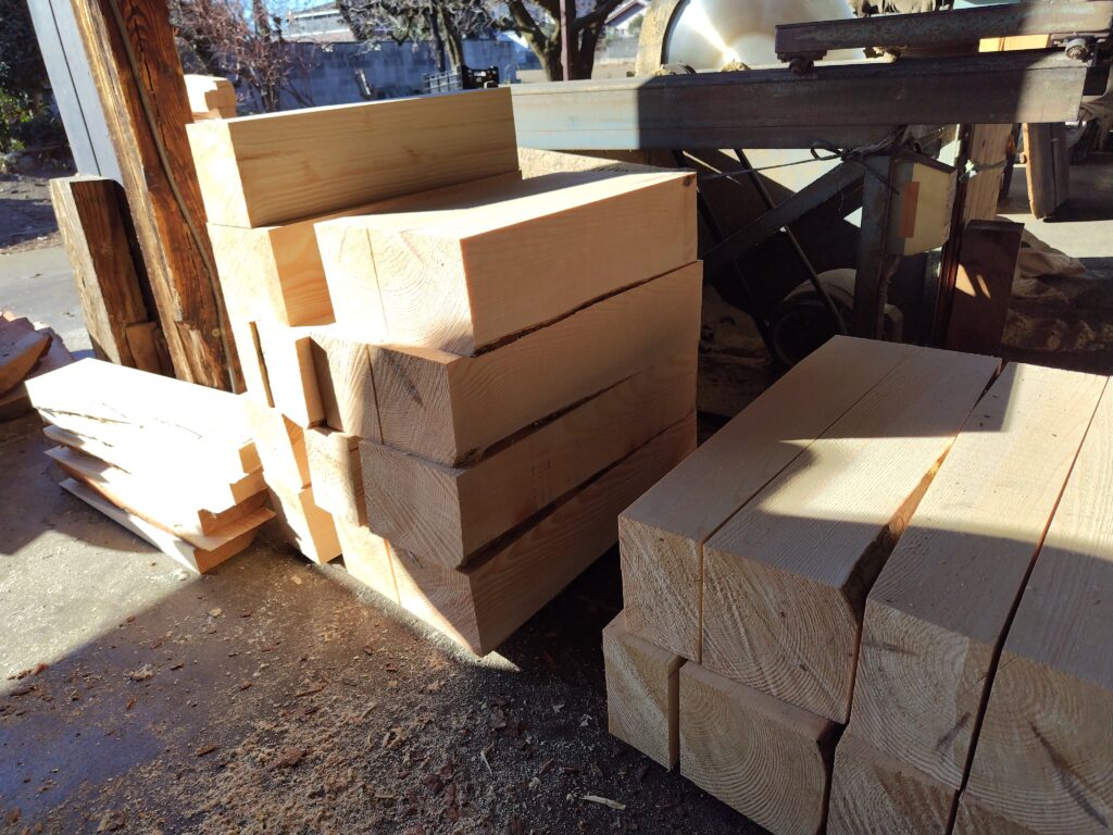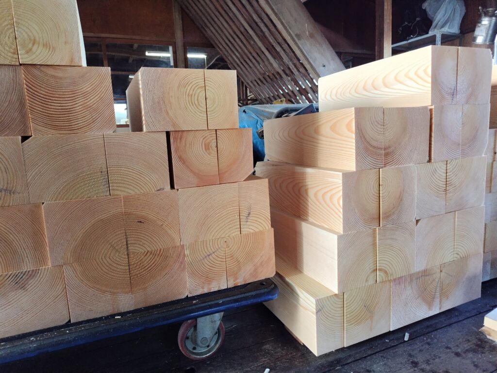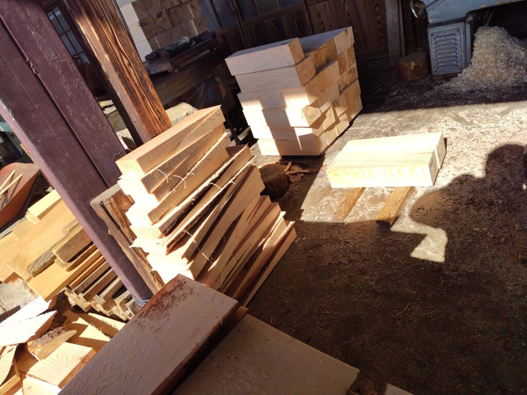 以上の作業は外で行われて、製材が終わったものは室内に運び込まれます。そしてこれから削りの作業に入ります。