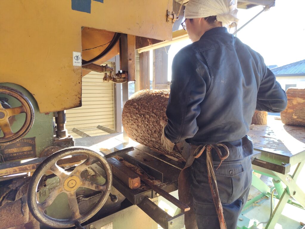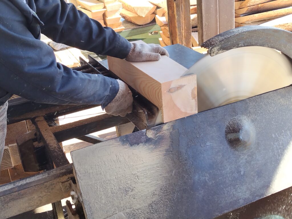 帯鋸である程度形を決めたら、今度は丸鋸で材の両側を切り落とします。つまりこの過程で最終的な材の長さが決まります。