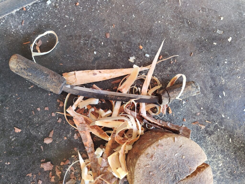 どうやって木の皮を落とすのかというと、両側に取っ手が付いた刃物で削り落とします。