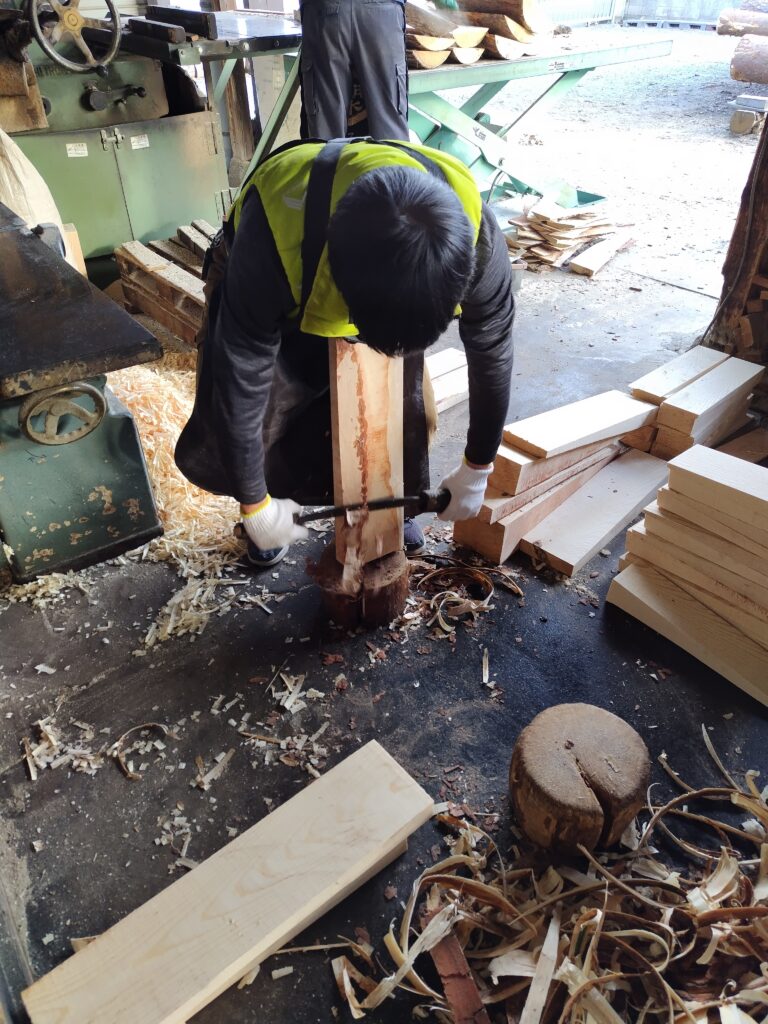 写真にある様に、材を体で押さえて刃物を上から下に下ろすという単純作業です。ただ、これを一日100回以上繰り返しやるとけっこうな重労働で、汗はかくし腰も痛くなります。