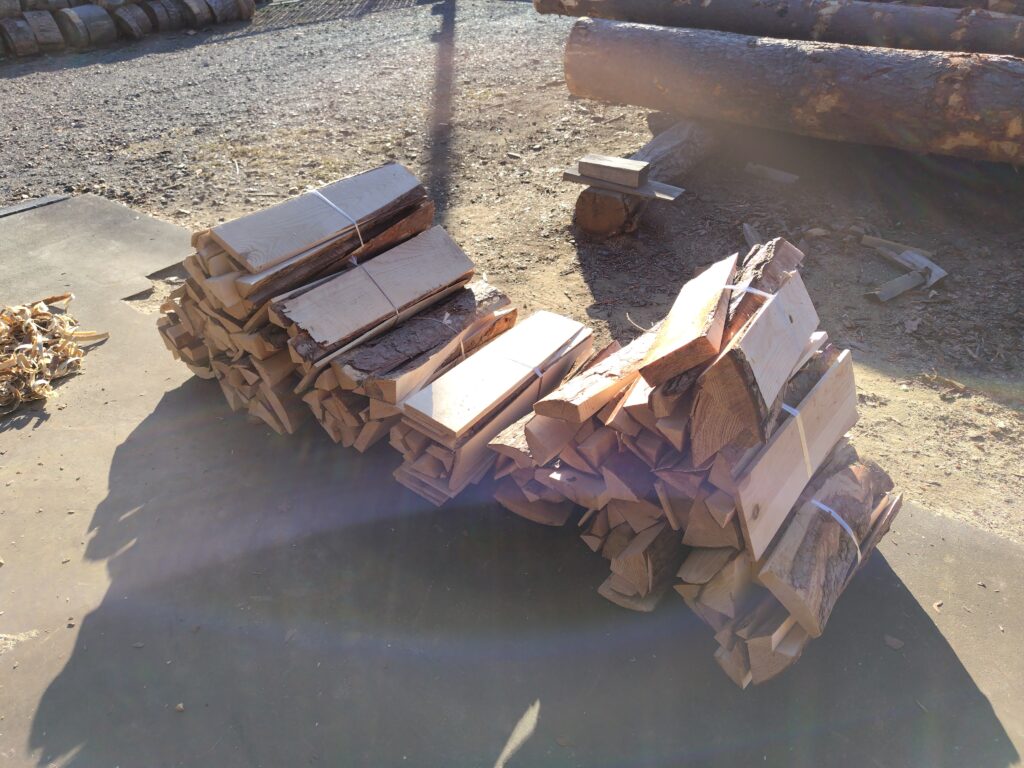 製品化が不可の部分に関してはこの様に束にされたあと暫く乾燥させて、薪ストーブの燃料にすると仰られてました。