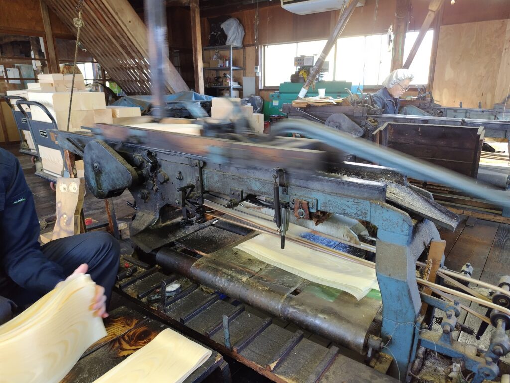 この機械は1分間に凡そ80~90枚の経木を作る事が出来るそうです。この時間はひたすらに機械音が室内に響き渡るのみで独特の空気感があります。機械音は結構大きく慣れないうちはうるさく感じますが、慣れてくると作業風景も相まって非常にエモーショナルな気持ちになります。