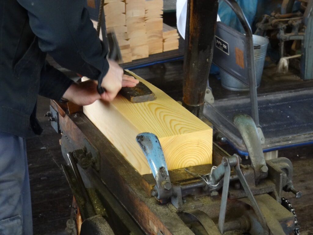 この過程で気を付ける事は、良くない木目や節があった場合にこの過程でしっかりと切り落として処理をする事になります。それをしなければ削りの段階で良い木目が出なかったり、固い部分を削って刃こぼれを起こしてしまう恐れがあるからです。